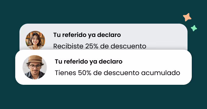 Por cada persona que declares gracias a tu invitación, recibes 25% de descuento en tu siguiente declaración. Puedes acumular hasta 50% de descuento al mes.